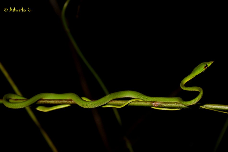 ಭಾರತ ಮತ್ತು ಆಗ್ನೇಯ ಏಷ್ಯಾದ ವಿವಿಧ ಭಾಗಗಳಲ್ಲಿ ಪೊದೆಗಳು ಹಾಗೂ ಮರಗಳಿರುವ ದಟ್ಟವಾದ ಸಸ್ಯವರ್ಗಗಳಲ್ಲಿ, ತಗ್ಗು ಪ್ರದೇಶದ ಹೊಳೆಗಳ ಬಳಿ ಕಂಡುಬರುವ ಈ ಹಸಿರು ಹಾವು ಕೊಲುಬ್ರಿಡೇ (Colubridae) ಕುಟುಂಬಕ್ಕೆ ಸೇರುತ್ತದೆ ಮತ್ತು ವೈಜ್ಞಾನಿಕವಾಗಿ ಇದನ್ನು ಅಹೇತುಲ್ಲಾ ನಸುತಾ (Ahaetulla nasuta) ಎಂದು ಕರೆಯಲಾಗುತ್ತದೆ. ಇದು ಸ್ವಲ್ಪ ವಿಷಕಾರಿಯಾಗಿದೆ. ಕಚ್ಚಿದಾಗ ಮಾನವರಲ್ಲಿ ನೋವು, ಊತ, ಮೂಗೇಟುಗಳು ಮತ್ತು ಮರಗಟ್ಟುವಿಕೆ ಉಂಟಾಗಬಹುದು. ಉದ್ದನೆಯ ತೆಳ್ಳಗಿನ ಇದರ ದೇಹವು ಪ್ರಕಾಶಮಾನವಾದ ಹಸಿರು ಬಣ್ಣ ಅಥವಾ ಮಸುಕಾದ ಕಂದು ಬಣ್ಣದಲ್ಲಿದ್ದು, ಮೊನಚಾದ ಮೂತಿಯನ್ನು ಹೊಂದಿರುತ್ತದೆ. ದೇಹದ ಕೆಳಗಿನ ಭಾಗದ ಬದಿಗಳಲ್ಲಿ ಹಳದಿ ರೇಖೆಯನ್ನು ಹೊಂದಿರುತ್ತದೆ. ಮೊಟ್ಟೆಯ ಪದರದೊಳಗಿನ ಭ್ರೂಣವು ತಾಯಿಯ ದೇಹದೊಳಗೆ ಬೆಳೆಯುತ್ತದೆ. ಹೆಣ್ಣು ಹಾವು ಸುಮಾರು 6-12 ಮರಿಗಳಿಗೆ ಜನ್ಮ ನೀಡುತ್ತದೆ. ಕಪ್ಪೆಗಳು ಮತ್ತು ಹಲ್ಲಿಗಳು ಇವುಗಳ ಪ್ರಮುಖ ಆಹಾರವಾಗಿವೆ.