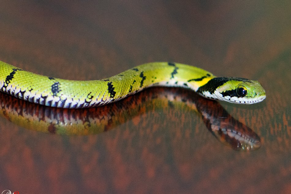 ಭಾರತ ಮತ್ತು ಶ್ರೀಲಂಕಾದ ಪರ್ಯಾಯ ದ್ವೀಪಗಳಲ್ಲಿನ ಬಯಲು ಪ್ರದೇಶಗಳಲ್ಲಿ, ಬೆಟ್ಟಗಳಲ್ಲಿ ಕಂಡುಬರುವ ವಿಷಕಾರಿಯಲ್ಲದ ಈ ಹಾವು ಕೊಲುಬ್ರಿಡೇ (Colubridae) ಕುಟುಂಬಕ್ಕೆ ಸೇರುತ್ತದೆ. ಇದನ್ನು ವೈಜ್ಞಾನಿಕವಾಗಿ ರಾಬ್ಡೋಫಿಸ್ ಪ್ಲಂಬಿಕಲರ್ (Macropisthodon plumbicolor) ಎಂದು ಕರೆಯಲಾಗುತ್ತದೆ. ಹಿಂಭಾಗವು ಪ್ರಕಾಶಮಾನವಾದ ಹಸಿರು ಬಣ್ಣದ್ದಾಗಿದ್ದು, ಕೆಲವೊಮ್ಮೆ ಕಪ್ಪು ಪಟ್ಟೆಗಳು ಅಥವಾ ತೇಪೆಗಳನ್ನು ಹೊಂದಿರುತ್ತದೆ. ಅಗಲವಾದ ತಲೆ, ದುಂಡಗಿನ ಕಣ್ಣುಗುಡ್ಡೆಗಳು ಮತ್ತು ಕುತ್ತಿಗೆಯ ಮೇಲೆ ಕಪ್ಪು ಮತ್ತು ಹಳದಿ ಬಣ್ಣದ ತಲೆಕೆಳಗಾದ V ಆಕಾರವನ್ನು ಹೊಂದಿರುತ್ತದೆ. ತೇವಾಂಶವುಳ್ಳ ಸಸ್ಯವರ್ಗ, ದಟ್ಟವಾದ ಪೊದೆಗಳು ಮತ್ತು ಬಿದ್ದಿರುವ ಎಲೆಗಳಲ್ಲಿ ವಾಸಿಸುತ್ತದೆ. ಕಪ್ಪೆಗಳು ಇವುಗಳ ಪ್ರಮುಖ ಆಹಾರವಾಗಿವೆ. ಜಾರುವಂತಹ ಕಪ್ಪೆಗಳನ್ನು ಹಿಡಿಯಲು ವಿಶೇಷವಾದ ಉದ್ದವಾದ ಹಲ್ಲುಗಳನ್ನು ಹಿಂಭಾಗದಲ್ಲಿ ಹೊಂದಿರುತ್ತದೆ. ಇವು 8-14 ಮೊಟ್ಟೆಗಳನ್ನು ಇಡುತ್ತವೆ.