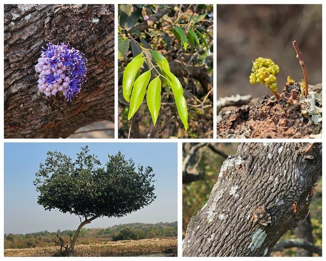 ಇದರ ಎಲೆಗಳು ಸುಮಾರು 5 ಸೆಂಟಿಮೀಟರ್ ಉದ್ದವಿದ್ದು, ಸರಳ ಎಲೆಗಳಾಗಿವೆ. ಸುವಾಸನೆಯಿಂದ ಕೂಡಿದ ನೀಲಿ ಬಣ್ಣದ ಕಿರು ಹೂಗಳು ಗುಚ್ಛಗುಚ್ಛವಾಗಿ ಇರುತ್ತವೆ. ಇದರ ಹಣ್ಣುಗಳು ನೇರಳೆ ಬಣ್ಣದಲ್ಲಿದ್ದು, ಸುಮಾರು ಒಂದು ಸೆಂಟಿಮೀಟರ್ ಗಾತ್ರ ಇರುತ್ತವೆ. ಸಾಮಾನ್ಯವಾಗಿ ಫೆಬ್ರವರಿಯಿಂದ ಮಾರ್ಚ್ ತಿಂಗಳಲ್ಲಿ ಹೂ ಬಿಡುತ್ತದೆ (ಪ್ರದೇಶಾನುಸಾರ ಸಮಯ ಬದಲಾಗಬಹುದು). ಇದರ ದೊಡ್ಡ ಮರವು ಮುಖ್ಯವಾಗಿ ಕಾಡುಗಳಲ್ಲಿ ಕಾಣಬಹುದು. ಕೆಲವು ವೇಳೆ ಕಾಡಂಚುಗಳಲ್ಲಿ ಈ ಮರ ಪೊದೆಗಳಂತೆ ಬೆಳೆದಿರುವುದನ್ನು ಕಾಣಬಹುದು.